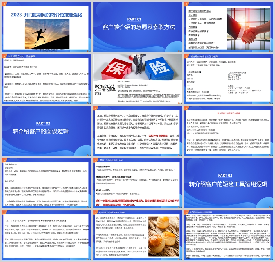 注意点:1.主动建立活动、引发兴趣2.筛选客户(根据活动内容筛选相关客户)3.不要有太强的目的性,增强客户体验感转介绍的方法之三活动索取【主动加入客户活动】加入户外旅游团加入爱心协会加入朋友的圈子……注意点:1.建立“广交朋友”的意识2.通过一个人,认识一个人、甚至一群人3.重在“养”不在于“成”转介绍客户的面谈逻辑PART02王姐,最近身材越来越好了,气色也更好了,这是身体健康的表现。向您学习!之前看您一直比较关注健康方面的事,正好我们公司近期开展了一系列客户权益更新活动,里面就有健康主题的特色活动。您看明天上午还是下午方便,我过去和您聊聊呗?