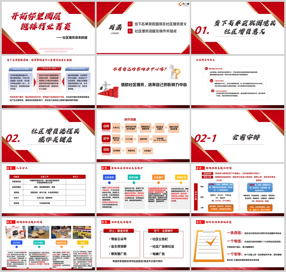社区增员体系构建需要在各个环节严格把控。会前要做好客量把控,打开前端,通过精准的人员分工、有效的物业关系维护和活动宣发,吸引更多的准增员参与活动。会中要严格按照流程标准运作,确保活动的顺利开展,通过破冰、公司介绍、活动交流等环节,获取准增员信息,进行甄选、转介绍和创说会邀约。会后要及时总结训练,持续提升,通过整理名单、总结经验和维护关系,为后续的增员工作打下坚实的基础。