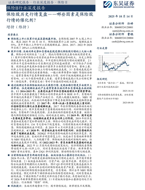 保险股的历史行情表明,其表现既受宏观环境和市场整体走势影响,也具有独特的行业特性。成功的投资需要准确把握股市行情、长端利率和负债端表现三大核心要素的配合。当前,保险板块正处于资产端与负债端共同改善的有利环境,叠加估值处于历史低位,具备较好的配置价值。未来,随着经济持续复苏和行业转型深化,保险股有望迎来新一轮的价值重估。