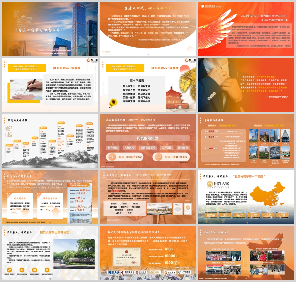 阳光保险集团自成立以来,经历了快速的发展。200512月,阳光人寿正式成立;200712月,阳光资管正式成立;20125月,国内首家险企投资医院——阳光融和医院获准筹建;201412月,阳光保险客户服务中心成为国家首家通过COPC顾客服务提供商标准认证呼叫中心;20164月,阳光保险历时八年建成的保险博物馆在阳光金融城正式开馆;20218月,阳光人寿成立“阳光·臻传”家族办公室;2022年,阳光保险保费突破千万元,成功在香港交易所主板上市,阳光人寿和阳光资管分别荣获中国证券报第三届“保险业投资金牛奖”和“保险资管公司金牛奖”。