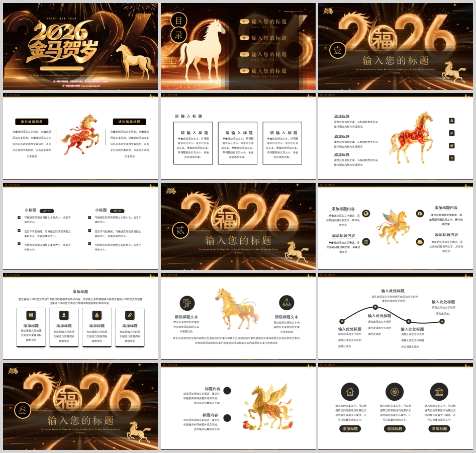 当黑色底金色字的PPT模板徐徐展开,"2026金马贺岁"的主题跃然眼前。金马象征着奔腾向前的力量与辉煌的未来,黑色背景则寓意着沉稳深厚的积淀。在这个充满希望的年份节点,我们既面临着传统生肖文化赋予的吉祥寓意,更承载着新时代发展的关键使命。