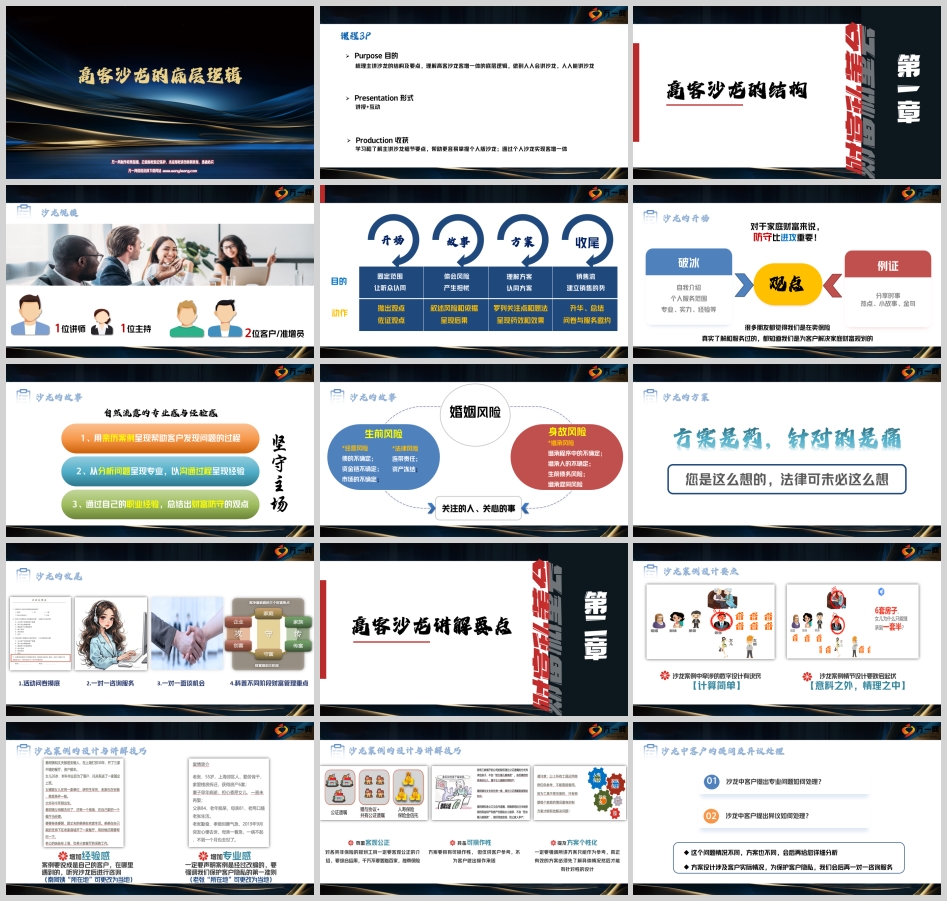 要点:案例设计需聚焦婚姻风险(继承程序不确定、继承人争议)、生前风险(经营/市场/法律风险:资金链断裂、连带责任、资产冻结)、身故风险(继承混同、生前债务传导)三大核心场景。讲述时需遵循亲历感+专业感原则——案例需包装为自己服务过的客户(如秦阿姨”“老张,地点可替换为当地城市),通过发现问题-分析问题-解决问题的沟通过程,自然呈现专业能力(如如何通过法律工具与保险组合防范继承纠纷)。同时,需强调尊重客观公正,对信托、遗嘱等非保险工具也给予中立评价,避免唯保险论