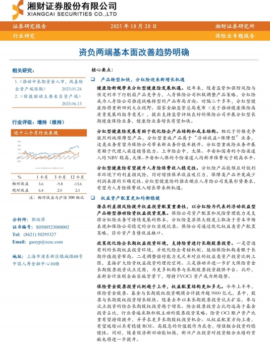 摘要: 在经历了长期的低位震荡与市场疑虑后,中国保险行业正站在一个关键的拐点上。湘财证券研究所的最新报告明确指出,行业资产端与负债端的基本面改善趋势已然明朗。负债端,以分红型健康险的“破冰”为标志,产品结构迎来历史性变革,有望驱动新业务价值率与保费收入的稳定性双重提升;资产端,在政策强力引导与自身配置需求驱动下,险资权益投资理念与结构正发生深刻变化,更加注重长期性与均衡性。资负两端的良性互动,共同构筑了行业未来稳健发展的坚实基石。