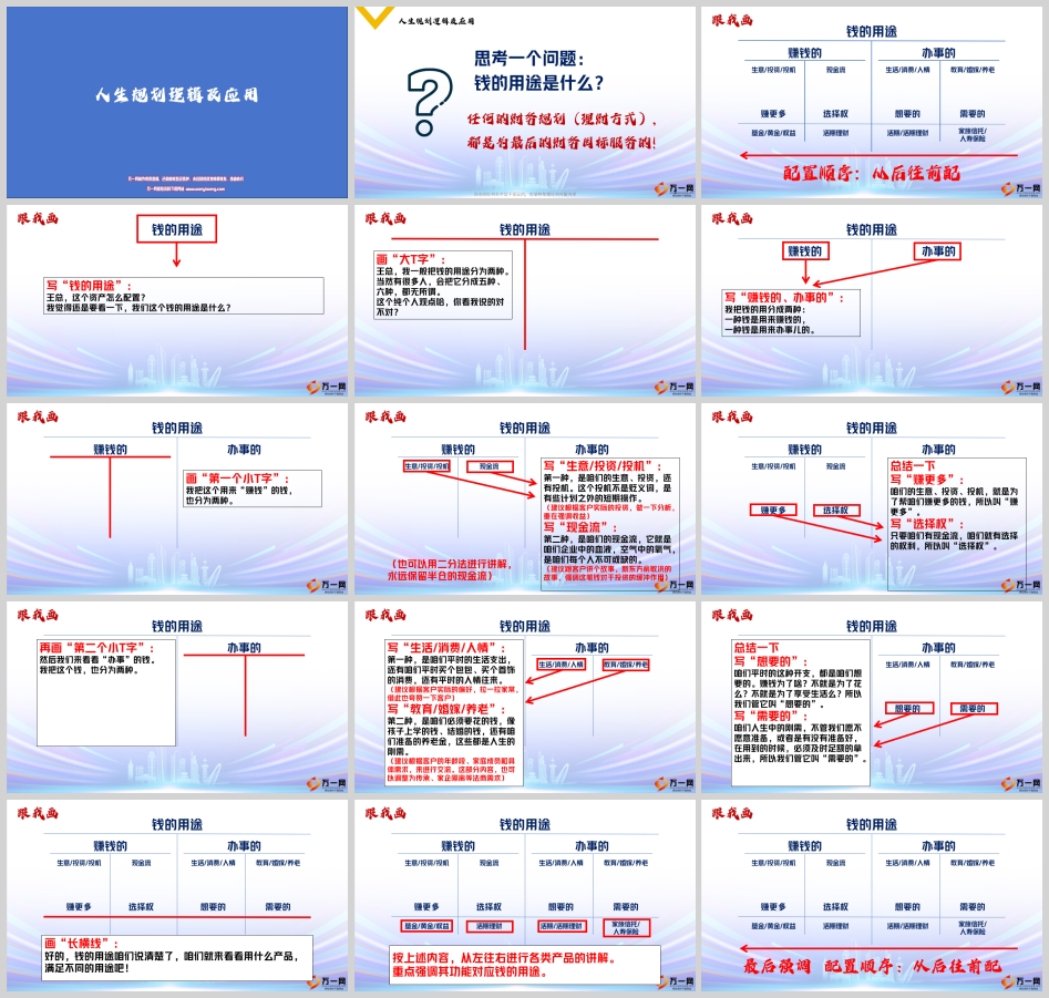 钱的用途可分为“赚钱的”和“办事的”两大类。其中,“赚钱的”钱又可细分为“生意/投资/投机”和“现金流”。生意、投资和投机是为了赚取更多的钱,而现金流则是企业和个人不可或缺的,如同企业中的血液、空气中的氧气,具有缓冲作用,就像新东方俞敏洪的故事所体现的,现金流对于投资的稳定至关重要。建议客户永远保留半仓的现金流。