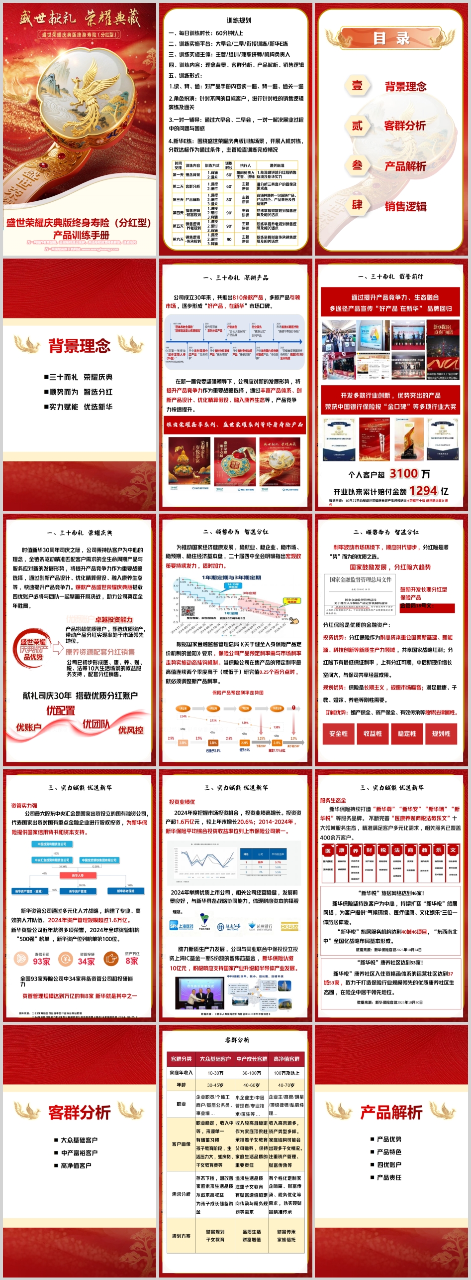 新华“盛世荣耀庆典版”终身寿险(分红型)的推出,是天时(利率环境)、地利(公司实力)、人和(客户需求)的完美结合。它不仅仅是一款保险产品,更是一个集保障、储蓄、投资、养老、传承于一体的综合性财务解决方案。通过本手册系统性的理念灌输、客群分析、产品解读与逻辑演练,全体营销伙伴必将能够深刻理解产品价值,精准匹配客户需求,以专业和自信,将这份“荣耀”与“保障”送至千家万户,在服务客户美好生活的同时,共同开创个人事业与公司发展的新辉煌!