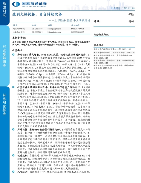 2025年三季报披露落下帷幕,保险行业交出了一份亮眼的答卷。在寿险新业务价值(NBV)景气增长、财险综合成本率(COR)持续改善、投资收益显著回暖的共同驱动下,上市险企盈利能力迎来大幅提振,资产负债管理亦呈现边际向好态势。