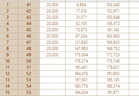被保人41岁起进入缴费期(年交2万),至49岁完成第9次缴费。观察现金价值变化: