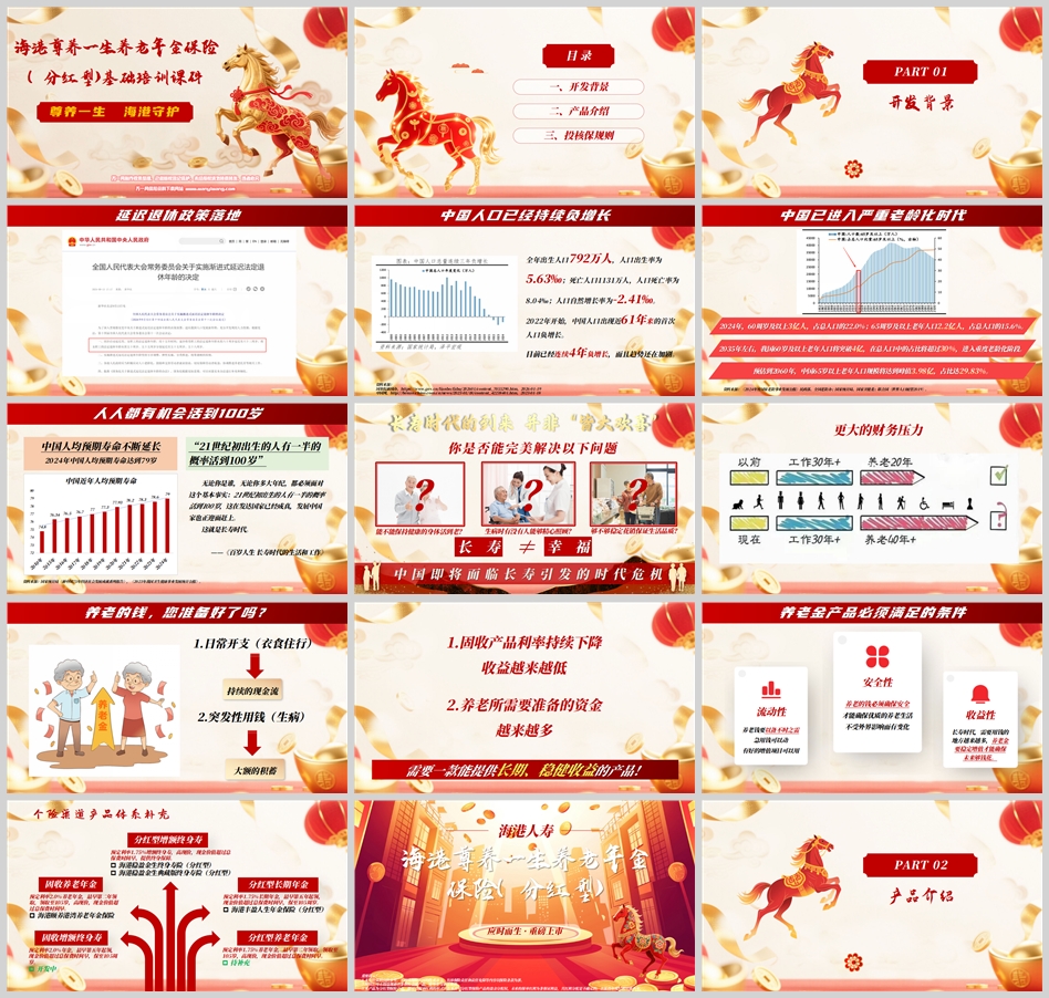 从市场供给看,个险渠道养老年金产品存在"两多两少":固收型多(预定利率2.0%)、短期领取多(55-60岁起领),而分红型少、灵活领取少。海港人寿现有产品体系中,固收养老年金(如"颐养港湾")侧重稳定领取,分红型增额寿(如"稳盈金生")侧重财富增值,但缺乏"养老年金+分红增值+灵活应急"的组合型产品。"尊养一生"的推出,正是填补这一空白,完善"固收+分红"的双轨养老解决方案。