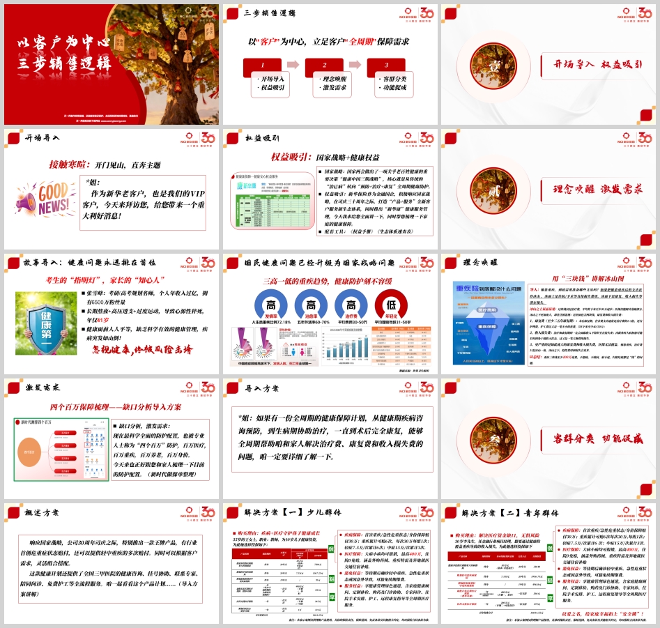 这套销售逻辑摒弃了传统的“推销思维”,转向真正的“顾问式服务”。它以客户需求为圆心,以全周期健康保障为半径,通过“开场导入·权益吸引—理念唤醒·激发需求—客群分类·功能促成”三个层层递进的步骤,将产品销售自然融入为客户解决问题的过程中。