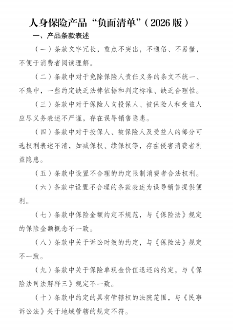 2026年,人身保险行业步入高质量发展的攻坚期。在产品供给侧改革的大潮下,中国银保监会发布的《人身保险产品“负面清单”(2026版)》格外引人注目。这份包含46条禁令的清单,从产品条款表述与产品责任设计两大维度,精准切中了当前市场上存在的顽疾与隐忧。