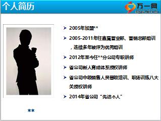 阅读话术:5分钟演练要求按照话术,认真投入每轮7分钟新人扮演者同时扮演观察者,并记录反馈演练点评新人多讲多练,主管总结点评角色扮演,双向训练,实战通关追踪新人每天约访量、约访成效及时了解新人的状况,定期进行追踪和辅导面谈人简历2005年加盟*2005-2011年任直属营业部、营销总部组训,连续多年被评为优秀组训2012年至今任**分公司专职讲师。