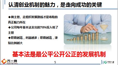 本法是为了什么而设置的?予公司,是为了减少公司经营成本但,逐利至上是营销员来到保险公司的目的吗?是的!!所以,在基本法我们作为内勤必须建立营销员的盈利建模否则,庞大的营销群体只会给公司带来更多的运营成本!172位总监84756位主管季均18.5万有效人力171.6亿期交保费40.5万收展队伍销售大军收展平台成就了156位100万年薪国寿企业家988位50万年薪国寿经理人17981位10万年薪国寿创业者区域总监成长至172位部经理级4069位成长到10599位主管人数23086位成长到84756位三年发展收展平台创造了这是一个英才辈出的年代!这是一个批量打造“险商” 的年代!这是一个“险商”创富,不断刷新高度的年代!备注:? 时间分配:30秒? 讲师介绍课程大纲。