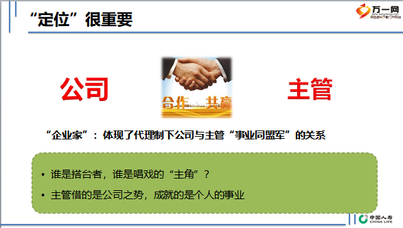“基本法”是寿险公司对于代理人的一系列最基本管理制度的统称,这些最基本的管理制度包括:法律关系界定、代理职级与职责、招募标准、组织管理架构、佣金、委托报酬、考核评定、日常管理规范等 ,“基本法”是寿险公司管理个人代理人的基本依据,是公司与代理人须共同遵守的基本大法,“ 基本法”建立的基础:委托代理关系,什么是“基本法”,“定位”很重要,谁是搭台者,谁是唱戏的“主角”?主管借的是公司之势,成就的是个人的事业,主管,“企业家”:体现了代理制下公司与主管“事业同盟军”的关系,备注:解读一、独特的机制,把主管称为企业家代表:甲方乙方的关系,企业事业合作者,而非隶属;,对于主管,借的是他人之势,成就的是个人的事业;不仅借势,还有可以利用的创业资本:解读二、品牌的重要,没有品牌的支持,个人难以成就;背靠强大实力品牌,成功梦想更近;解读三、自主和意义,企业经营好,受益最大的绝对是主管本人;经营不善,损失最大的也是主管。