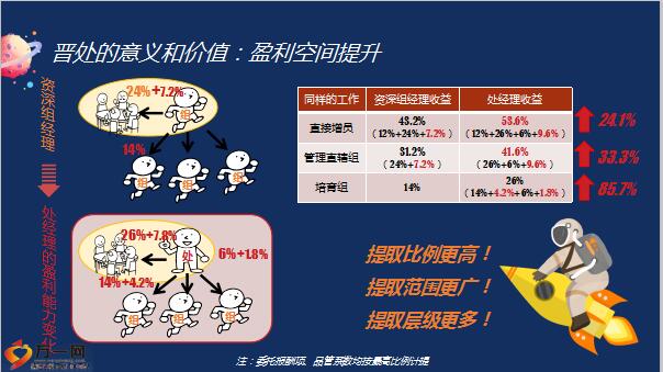 你在组经理职级停留多久了?下一步该往哪去呢?你思考过这个问题吗?晋处的意义和价值:收入来源增加,直辖组津贴从24%上升至26%!增加了处经理直辖津贴(最高6%)!增加了责任津贴(最高2250元)!既能够培育组,还能够培育处!资深组经理与处经理基本法委托报酬项目对比:晋处的意义和价值:盈利空间提升,晋处的意义和价值:收入水平跨越,处经理级主管月人均收入超2.9万元,月人均基本法收入超1.5万元,组经理级主管收入与处经理级主管主管差距明显!基本法在做大直辖的同时鼓励晋升文化,利益的获取也倾向中高级主管!