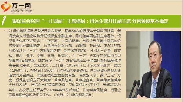 21世纪经济报道记者近日多方获悉,现年54岁的银保监会首席风险官、新闻发言人肖远企或将升任银保监会副主席,同时随着两位副主席退休,银保监会也将正式迎来“一正四副”主席的格局。肖远企升任副主席后的分管领域也已基本确定,包括股份制银行部、非银部、政研局。在2018年8月银保监会“三定”方案落定之前,副主席共有7名,分别为王兆星、陈文辉、黄洪、曹宇、周亮、梁涛、祝树民。而“三定”方案限定银保监会只能设置4名副主席。陈文辉在“三定”方案落地后出任全国社会保障基金理事会副理事长、党组成员,王兆星(1959年)已于2019年退休,黄洪(1960年)、祝树民(1960年)也将陆续到龄退休。肖远企被业内视为熟谙境内外金融业、宏观和微观监管的复合型、专家型人才。据“三定”方案,银保监会设立四大首席:首席风险官、首席检查官、首席律师和首席会计师各1名,肖远企出任首席风险官,同时兼任办公厅主任、新闻发言人。其中,办公厅主任职务于2020年春节前后卸任。作为首席风险官,肖远企高度重视金融风险相关工作。(来源:21世纪经济报道)