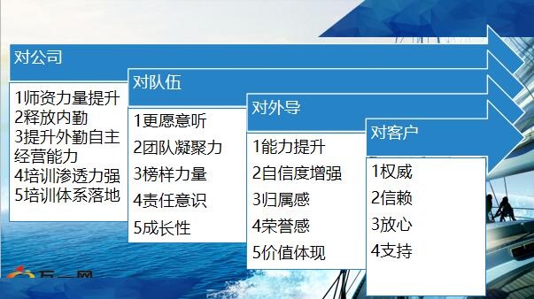 为什么建立外导队伍公司需要?队伍需要?市场需要?备注:了解学员对外勤导师的理解,为什么要招募?是公司需要?还是队伍需要?还是市场需要?备注:首先是扩量,这是前提。如何扩量,可以通过四方面一、树立理念、营造氛围备注:氛围炒作,从内至外推动二、树立标杆、包装榜样备注:现身说法:通过外导演说分享达到目的,如讲自己:成为外导前的我和成为外导后的我1、营造外勤导师身份的荣誉性、特殊性2、职场专门的外导荣誉墙、个人荣誉海报3、每月的岗前、衔训、创说会、产说会等主讲人安排公示4、外导星级、品牌课程、授课津贴、授课奖励等上墙。