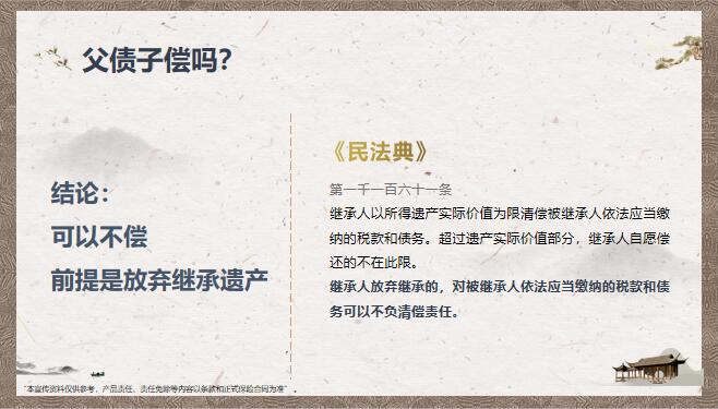 继承人放弃继承的,对被继承人依法应当缴纳的税款和债务可以不负清偿责任。前提是放弃继承遗产债务隔离《最高人民法院关于保险金能否作为被保险人遗产的批复》(1988年3月24日)根据我国《保险法》规有关条文规定的精神,人身保险金能否列入被保险人的遗产,取决于被保险人是否指定了受益人。指定了受益人的,被保险人死亡后,其人身保险金应付给受益人;未指定受益人的,被保险人死亡后,其人身保险金应作为遗产处理,可以?用来清偿债让遗产变成保险赔款,给子女一个选择的权利子女即将结婚的家庭定向传承,指定受益人周女士,单亲家庭。