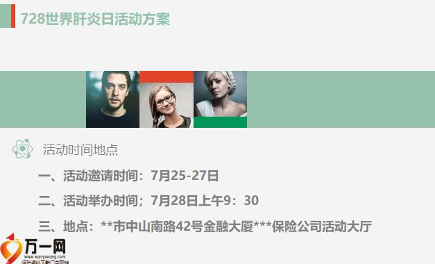 728世界肝炎日“积极预防,主动检测,规范治疗,全面遏制肝炎危害”活动策划方728世界肝炎日活动方案一、紧密围绕“积极预防,主动检测,规范治疗,全面遏制肝炎危害”宣传主题,大力宣传肝炎防治相关知识,进一步提高太保客户肝炎防治知识的认识,有效降低肝炎的发病率,增进客户的健康。二、结合肝炎谈保险,加强客户的保险意识与功能, 让客户意识到保障的重要性。三、介绍公司明星产品,为客户增加保障,规避疾病风险。活动时间地点一、活动邀请时间:7月25-27日二、活动举办时间;7月28日上午9:30三、地点:**市中山南路42号金融大厦***保险公司活动大厅728世界肝炎日活动方案主要活动项目一、肝炎预防名医宣讲及义诊 (** 中心医院:梁教授主讲)二、保险让生活更美好宣讲(***保险:王经理)三、保险产品发布及抽奖活动 肝炎预防名医宣讲及义诊详情一、专家进行预防肝炎讲座二、发放肝炎宣传材料。