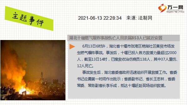 6月13日6时许,湖北省十堰市张湾区艳湖社区集贸市场发生燃气爆炸事故。事发后,十堰已投入各方救援力量超过2000人,截至13日14时,已搜救收治伤病员138人,其中37人重伤、12人死亡。