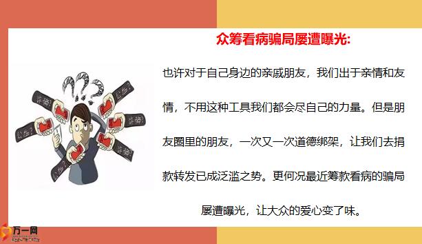 众筹看病骗局屡遭曝光:朋友圈里的筹款链接几乎每天不断,以前一直觉得生大病离自己好远,现在感觉好像就在身边,并且不断有朋友在群里号召大家给谁谁谁捐款,谁谁谁很可怜。