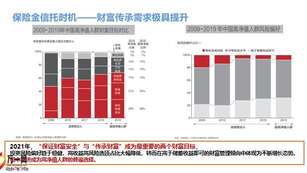 榜单显示,今年共有来自68个国家、2402家公司的3228位十亿美金企业家上榜,比去年新增412位,创历史新高。其中,亚洲十亿美金企业家人数占全球51%,总财富占全球45%,首次超过世界其他地区的总和。“在过去的一年里,中国新增的新面孔比世界其他国家加起来的还要多,而且远远超过了美国,成为世界上第一个拥有1000位已知十亿美金企业家的国家,有1058位。”全球富豪聚集国家,保险金信托时机——中国富人数量全球第一*资料来源:搜狐网、金融界,2020年可投资资产在1000万元以上的中国高净值人群数量达262万人。预计到2021年底,中国高净值人群数量将达到296万人,可投资资产总规模将接近96万亿元。报告称,大陆中产家庭数量达3320万户,其中新中产1000万户以上;拥有千万资产的“高净值家庭”有158万户,其中拥有亿元资产的“超高净值家庭”有10.5万户。保险金信托时机——中产家庭、高净值人群大幅提升*资料来源:搜狐网、金融界,2021年,“保证财富安全”与“传承财富”成为最重要的两个财富目标,投资风险偏好趋于稳健,高收益高风险选项占比大幅降低,转而在高于储蓄收益即可的财富管理倾向中体现为不断增长态势。稳中求进成为高净值人群的普遍选择。保险金信托时机——财富传承需求极具提升,值得注意的是,创富一代的企业家群体占比由2019年的36%降至2021年的25%,作为“富二代”的继承二代群体占比则由9%提升至12%。报告强调,随着创富一代的年纪渐长,二代继承人渐渐成熟,部分一代创业者开始传承规划并步入退休期,继承二代群体进入传承期;中国未来10年将有17万亿财富传给下一代,未来20年将有39万亿财富传给下一代,未来30年将有60万亿财富传给下一代。规划传承,已经是高净值人群认真思考及积极面对的重要事项。保险金信托时机——财富传承需求极具提升*资料来源:搜狐网、金融界、北青网,2021年中国个人持有的可投资资产,仅有保险、境外投资、银行产品,为正增长,保险类投资复合增长率为6%,排名第一。2008年以来复合增长率达到121%保险金信托时机——国民财富迅速增长催生家庭财富管理需求保险金信托时机——客户保险需求旺盛与实际配置不足的矛盾,*资料来源:保险经济网、央视财经、《2019中国私人财富报告》距离2018年4月监管机构下发的《关于规范金融机构资产管理业务的指导意见》(以下简称“资管新规”)发布已经近一年的时间。北京商报记者注意到,受“资管新规”影响,信托行业资产规模同比下滑,收益率有所下降 在分析人士看来,“资管新规”发布之后,资管机构开始向主动管理转型发展,探索挖掘细分市场机会,而中产阶级家庭财富传承这一空白市场正是有待挖掘的潜力市场。 预计未来将有更多低门槛的信托产品问世,尤其随着资金信托新规的落地,信托产品或将向普惠化方向发展,以满足大众日益多样化、个性化的金融需求。据悉,国内目前绝大部分为融资类信托,仅相当于金融工具,不具备传承属性。家族信托虽具备传承与隔离功能,但是门槛过高,普遍在1000万以上,适合中产阶级、具备代际传承分配功能的家庭信托仍处于起步阶段,市场非常广阔。除家族信托和慈善信托外,资产证券化、养老金信托、保险金信托等也是未来有待拓展的业务方向。