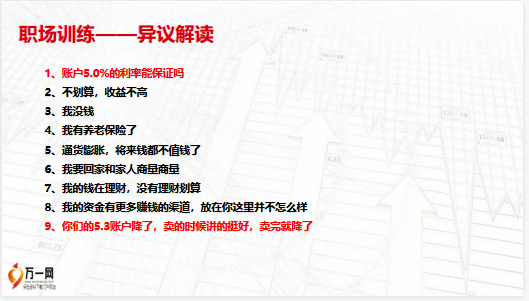 共同富裕 · 央企态度鑫裕尊享(必备技能之四)产品培训大纲:5、十大异议处理,职场训练——异议解读1、账户5.0%的利率能保证吗2、不划算,收益不高3、我没钱4、我有养老保险了5、通货膨胀,将来钱都不值钱了6、我要回家和家人商量商量7、我的钱在理财,没有理财划算8、我的资金有更多赚钱的渠道,放在你这里并不怎么样9、你们的5.3账户降了,卖的时候讲的挺好,卖完就降了,异议处理一:5.0账户能保证吗?1、您可以看我们的历史结算收益,我们的账户每个月都会对外公布一次利率,自账户成立以来,一直都很稳定,即使受疫情的影响有过波动,基本也在4.5%左右,随着疫情的管控和经济的复苏,当前账户收益迅速回暖至5%左右。2、我们的投资渠道(一条底线)加强风控,坚守风险底线,保证资产的安全性。投前有分析,投中有判断,投后有管理。(九大主题)这些项目都是国家性的,普通老百姓接触不到。基本上都是国家的基础项目建设。收益稳健高效。3、即使按照合同的2.5%保底利率算,对比欧美国家的利率现状,优势依然明显。单利复利换算,建立万能账户特别储备机制稳定结算水平,特储机制如何平滑收益率?在没有特别储备的情况下,账户投资收益率超过结算利率的部分全部计入当期公司利润,无法用于未来结算。投资收益率不足时,根据监管要求,需及时下调账户结算利率,无法保持结算利率的相对稳定。建立特别储备后,在资本市场上涨时,投资收益率高于结算利率的一部分可以特别储备形式得到积累,支持后续结算。在资本市场下跌时,前期积累的特储可和当期投资收益一同用于当期结算。发挥“削峰填谷”的作用,增强主力账户的收益稳定性!异议处理二:不划算,收益不高1、这个产品最好的地方就在于长短自如,相当于是定期存款+活期存款的组合,用五年的封闭定期开户,保终身的活期账户。从第五年末开始,年初存进去的10万元,年末就进入了当前5%的复利增值账户中,从第五年末至第九年末每年的钱就像活期的理财,持续享受当前5%的复利收益,如果这五年都没动,相当于银行单利的5.67%,也就是每年保险公司都会额外给出5670元的利息。前面存的五年定期也不吃亏,第十一年开始陆续分批次返还,同样进入到活期账户中复利增值,想用就用,不想用统统持续复利计息。2、我想您家里十年前的保单一定都在吧?但十年前您的存单还在吗?用十年的时间让自己强制储蓄,给未来留下的就是一辈子持续可以使用的现金流。再说了,这份保险可长可短,十年如果觉得长,您存五年有问题吗?如果五年没有问题,那这份保单就一定不会有问题,中间的活期随时都是可以支取的。,日常开销,子女教育,人情往来,父母赡养自己未来养老,人这一辈子,挣钱的时间是有限的,也就25-60岁之间,但花钱的时间却是无限的,我们在有限的挣钱时间内,不仅需要支付子女教育、父母赡养、日常开销和人情往来等等,同时还要储备未来自己养老的钱,这一些都要提前准备。,保险不是消费,而是留钱,让我们养成定期储蓄的习惯,让钱生钱,储备我们人生任意阶段都能有足够花的钱。