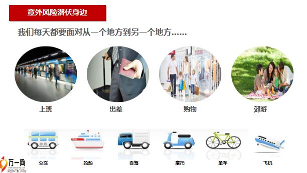 备注: 时间分配:1分钟,生命最大的精彩在于未来可以期待,生命最大的遗憾在于风险无处不在,我们喜欢精彩,不喜欢风险,但这些都不以我们的意志来决定。精彩我们乐见其成,但是如果是风险,我们有提前做好应对的措施吗?人生三大风险:疾病,意外和养老,其中最不可控的风险,当属意外风险。明天和意外哪个先到来?在保险界,我们最常听到的一句话就是:不知道明天和意外哪个先到?我们先看到听到了太多因意外而失去明天的事例!我们每天都要面对从一个地方到另一个地方……