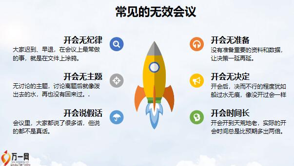 开会无主题。无讨论的主题,讨论离题后就像泼出去的水,再也没有回来过。.开会无决定。开会后,决而不行的程度犹如船过水无痕,像没开过会一样,开会说假话。会议里,大家都说了很多话,但说的都不是真话。开会时间长。开会开到天荒地老,实际的开会时间总是比预期多出两倍。无效会议,降低管理效率,浪费时间操作要点:讲授,表述重点:这类无效会议不仅降低管理效率还浪费时间。达成共识、解决问题,会议时间恰如其分与会各方达成共识,会议结果具体有效什么是有效的会议,会议决定得到落实,操作要点:讲授