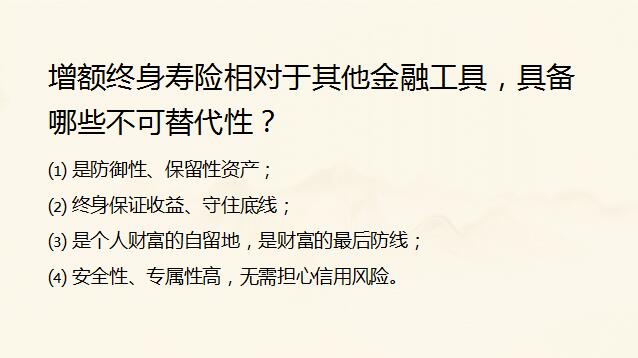 若以长期且安全作为衡量标准,金融工具的分类就为两类:保险和其它。增额终身寿险相对于其他金融工具,具备哪些不可替代性?⑴ 是防御性、保留性资产;⑵ 终身保证收益、守住底线;⑶ 是个人财富的自留地,是财富的最后防线;⑷ 安全性、专属性高,无需担心信用风险。为什么迫切需要增额终身寿险?⑴ 利率持续下行使增额终身寿险成为时代的宠儿⑵ 黑天鹅事件频发使增额终身寿险成为资金的避风港⑶ 老龄化趋势使增额终身寿险成为养老的必备品,增额终身寿险的特点,增额终身寿险的五大功能⑴ 是一种资产型的保单⑵ 可锁定未来的长期收益⑶ 是家庭的现金保险柜