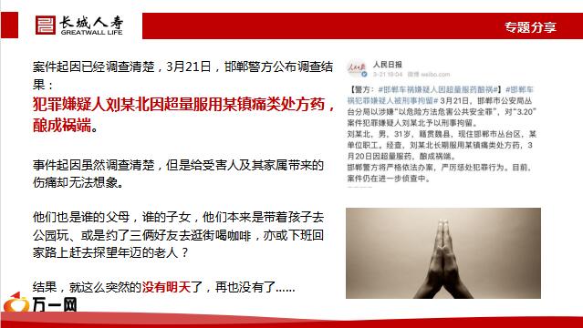 2022年,注定是不平静的一年。年初俄乌冲突、3月国内疫情反复⋯⋯每一样都在牵动人们的心。近期,又发生了两起令人揪心的重大突发事件:3月20日,邯郸发生一起重大交通肇事事故;3月21日,一架搭载132人的波音737客机在广西梧州藤县掉落;3月20日,在河北邯郸市一交通路口,非机动车道上骑电动车的市民正在等待通行,一辆白色轿车突然从后方冲撞过来,将十几位等待通行的市民撞倒。目前事故已经造成4人死亡,14人受伤。案件起因已经调查清楚,3月21日,邯郸警方公布调查结果:犯罪嫌疑人刘某北因超量服用某镇痛类处方药,酿成祸端。事件起因虽然调查清楚,但是给受害人及其家属带来的伤痛却无法想象。