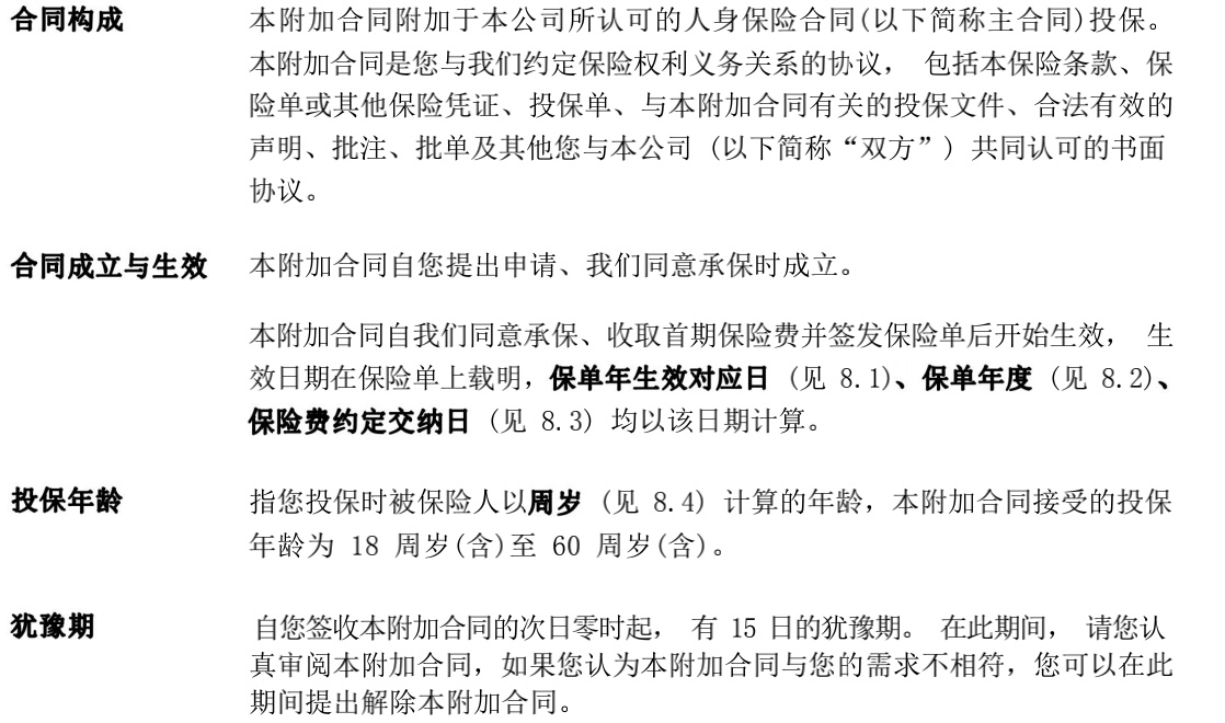 本附加合同附加于本公司所认可的人身保险合同(以下简称主合同)投保。本附加合同是您与我们约定保险权利义务关系的协议, 包括本保险条款、保险单或其他保险凭证、投保单、与本附加合同有关的投保文件、合法有效的声明、批注、批单及其他您与本公司 (以下简称“双方”) 共同认可的书面协议。本附加合同自您提出申请、我们同意承保时成立。本附加合同自我们同意承保、收取首期保险费并签发保险单后开始生效, 生效日期在保险单上载明, (见 8.1) (见 8.2)
