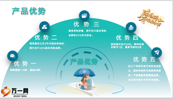 优势四,前三个保单年度内享有电话医生、重疾绿通两项健康管理服务。产品理赔范围覆盖全球,无论境内境外均可申请理赔。优势五,产品优势,保障重疾118种,轻症48,涵盖166种疾病覆盖人生多个阶段的多种高发疾病,保障范围广泛,给您稳稳的健康呵护。罹患重大疾病后,三年内因疾病身故,我们将额外给付30%特别金。关爱有加,保障周到重大疾病保险金+基本保险金额的 50%。
