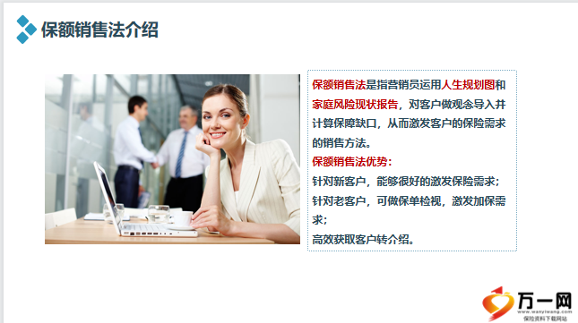 保额销售法优势:针对新客户,能够很好的激发保险需求;针对老客户,可做保单检视,激发加保需求;高效获取客户转介绍。