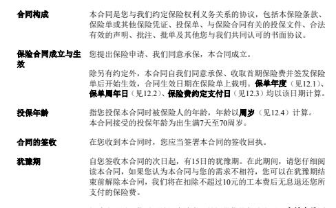 1.2保险合同成立与生效您提出保险申请、我们同意承保,本合同成立。除另有约定外,本合同自我们同意承保、收取首期保险费并签发保险单后开始生效,合同生效日期在保险单上载明。保单年度(见12.1)、保单周年日(见12.2)、保险费约定支付日(见12.3)均以该日期计算。1.3投保年龄指您投保本合同时被保险人的年龄,年龄以周岁(见12.4)计算。本合同接受的投保年龄为出生满7天至70周岁。1.4合同的签收在您收到本合同时,您应当签署本合同的签收回执。1.5犹豫期自您签收本合同的次日起,有15日的犹豫期。在此期间,请您仔细阅读本合同,如果您认为本合同与您的需求不相符,您可以在犹豫期结束前解除本合同,我们将在扣除不超过10元的工本费后无息退还您所支付的保险费。解除合同时,您需要填写申请书,并提供您的保险合同及有效身份证件(见12.5)。