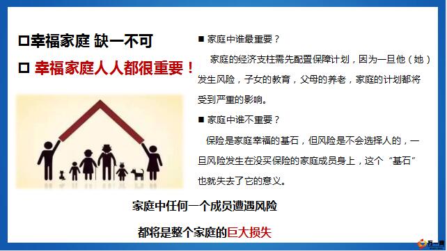 家庭中谁不重要?保险是家庭幸福的基石,但风险是不会选择人的,一旦风险发生在没买保险的家庭成员身上,这个“基石”也就失去了它的意义。幸福家庭 缺一不可幸福家庭人人都很重要!家庭中任何一个成员遭遇风险都将是整个家庭的巨大损失总公司“三全”理念从产品单一销售向产品组合销售转变从个人保单销售向家庭账户销售转变“家庭账户”作为升级版的“以客户为中心”业务模式,从聚焦个体客户延伸到家庭成员。“家庭账户”的模式,既能为客户提供更持续、动态和全面的产品与保障服务,同时也可帮助我们提升客户关系管理,增强客户粘性与深度挖掘客户价值。每个家庭成员对于一个家庭来说都至关重要,任何一个家庭成员的风险保障都不能遗漏。