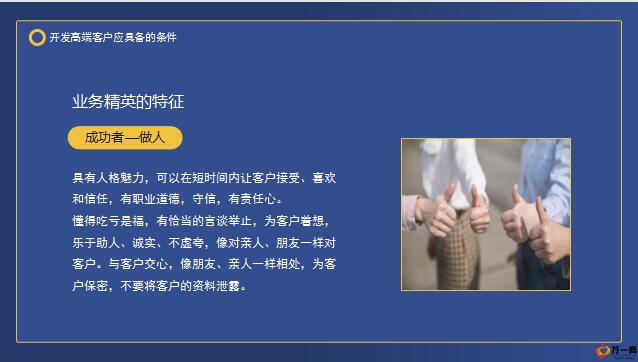 与客户交心,像朋友、亲人一样相处,为客户保密,不要将客户的资料泄露。业务精英的特征成功者—态度逢人谈保险具有耐心、爱心、诚心平常心快乐工作,坚持——当你想放弃时,请再试多一次理性、客观、自信认同行业,时刻维护公司形象敢于做大保单把保险当做事业经营时刻注意自身形象开阔视野,不断学习才是长久之道敬业、勤奋、好的精神状态成功者—专业熟悉保险方面的知识,说话语气肯定,外表形象专业。跳出保险看保险,在与客户解释关于保险方面的问题时,用客户熟悉的事物或语言去解释,使客户容易接受。了解同业公司的情况,知识面广,少说、会说。