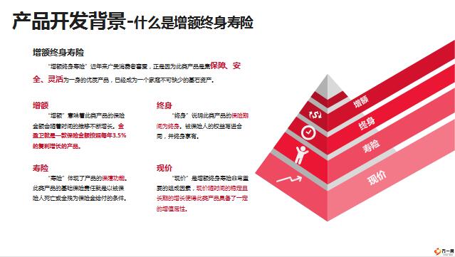 浅谈金盈卫和富金生产品解析1产品开发背景2产品特色优势3投保案例演示4产品责任介绍增额终身寿险“增额终身寿险”近年来广受消费者喜爱,正是因为此类产品是集保障、安全、灵活为一身的优质产品,已经成为一个家庭不可缺少的基石资产。增额“增额”意味着此类产品的保险金额会随着时间的推移不断增长。金盈卫就是一款保险金额按照每年3.5%的复利增长的产品。终身“终身”说明此类产品的保险期间为终身。被保险人的权益写进合同,并终身享有。寿险“寿险”体现了产品的保障功能。此类产品的基础保险责任就是以被保险人死亡或全残为保险金给付的条件。现价“现价”是增额终身寿险非常重要的组成因素,现价随时间的稳定且长期的增长使得此类产品具备了一定的增值属性。