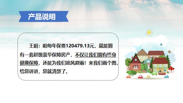 “康健华尊医疗保险(费率可调)”为费率可调的长期医疗保险产品,在保证续保期间内或保证续保期间届满时保险费率可能调整。5.四种方案对应的保险产品组合仅为保障建议,消费者可单独购买任一主险产品。王姐:咱每年保费120479.13元,就能拥有一套超级豪华保障房产,不仅让我们拥有终身健康保障,还能为我们遮风避雨!来我们画个图,给您讲讲,您就清楚了。产品说明首先,健康新享可以为我们提供最基础的身价保障,这个就是我们的健康保障基础。最重要的是,在基础之上面有四大支柱,轻、中、重、惠全都保,为我们提供基础牢固的健康保障。第一根支柱轻:轻症保,若发生40种轻症的一种或多种,我们最多可以赔6次,每次最少赔12万,这样一算,累计最高可以赔99万。