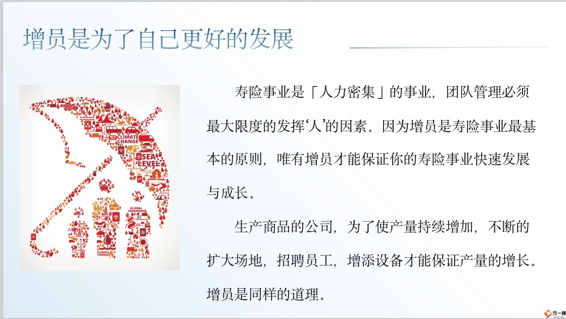 对公司来说,更多的人力意味着更高的业绩;对增员人来说,更多的增员意味着更高的职级;对新人来说,更多的人陪自己学习,意味着更长久的留存。这种一举三得的事情,绝对不会因为疫情的猖狂而停止。毕竟发展才是硬道理,在真正做事的人面前,一切困难都是纸老虎。增员是为了自己更好的发展寿险事业是「人力密集」的事业,团队管理必须最大限度的发挥‘人’的因素。因为增员是寿险事业最基本的原则,唯有增员才能保证你的寿险事业快速发展与成长。生产商品的公司,为了使产量持续增加,不断的扩大场地,招聘员工,增添设备才能保证产量的增长。增员是同样的道理。