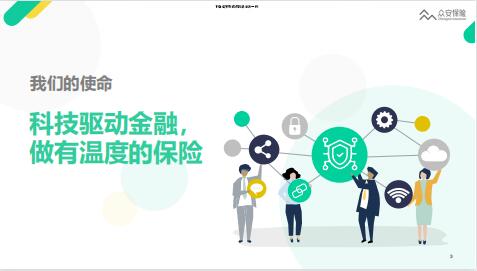 免责申明本演示稿仅为众安在线财产保险股份有限公司(以下简称“公司”)编制,仅供参考。在阅读或使用此文件前,调下必须阅读以下条款、细则、限制、约束、确认及陈述(以下合称“条款”)。接受、阅读或使用此文件或参加本文件相关的发布会即代表阆下确认及同意受条款约束。如果阁下不接受任何条款的全部或部分,请立刻将此文件退回公司。本文件仅供阁下参考且不得用作任何其他用途。