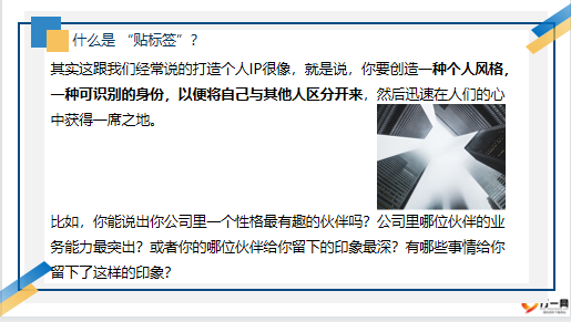 什么是 “贴标签”?PART 02其实这跟我们经常说的打造个人IP很像,就是说,你要创造一种个人风格,一种可识别的身份,以便将自己与其他人区分开来,然后迅速在人们的心中获得一席之地。比如,你能说出你公司里一个性格最有趣的伙伴吗?公司里哪位伙伴的业务能力最突出?或者你的哪位伙伴给你留下的印象最深?有哪些事情给你留下了这样的印象?当你提到某种特征或能力时,你会立即想到自己某个伙伴,反过来,当你提到那个伙伴时,你会想到他拥有的某种特征或能力,这就叫“标签化”,标签化能让社会与他人更快的认识到自己,是帮助你快速寻找到认同感与存在感的一种方式。