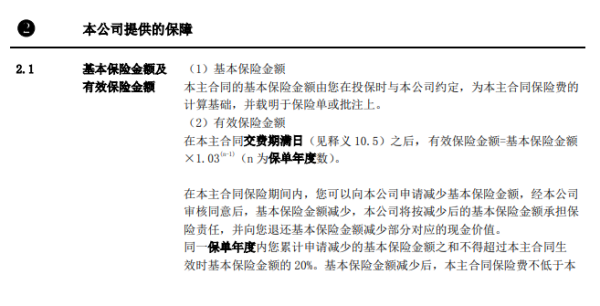 1.4犹豫期自您签收本主合同的次日起,有20日的犹豫期。在此期间,请您认真审视本主合同,如果您认为本主合同与您的需求不相符,您可以在此期间以书面形式通知本公司解除本主合同,并退回本主合同的原件。自本公司收到您的书面通知当日起,本主合同即被解除,本公司自始不承担保险责任,本公司将在扣除不超过10元的工本费后无息退还您所交纳的本主合同保险费。本公司提供的保障2.1基本保险金额及有效保险金额(1)基本保险金额本主合同的基本保险金额由您在投保时与本公司约定,为本主合同保险费的计算基础,并载明于保险单或批注上。(2)有效保险金额在本主合同交费期满日(见释义10.5)之后,有效保险金额=基本保险金额×1.03 t(n为保单年度数)。在本主合同保险期间内,您可以向本公司申请减少基本保险金额,经本公司审核同意后,基本保险金额减少,本公司将按减少后的基本保险金额承担保险责任,并向您退还基本保险金额减少部分对应的现金价值。同一保单年度内您累计申请减少的基本保险金额之和不得超过本主合同生效时基本保险金额的20%。基本保险金额减少后,本主合同保险费不低于本公司规定的最低标准。2.2未成年人身故保险金限制为未成年子女投保的人身保险,约定的被保险人身故给付的保险金额总和、被保险人身故时实际给付的保险金总和不得超过国务院保险监督管理机构规定的限额。2.3保险期间本主合同的保险期间为被保险人终身,自本主合同生效日次日零时起至被保险人身故时止。