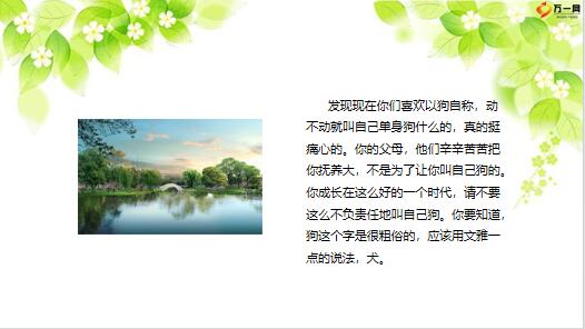 你要知道,狗这个字是很粗俗的,应该用文雅一点的说法,犬。小成翻看相簿,好奇地问正在做饭的母亲:“妈妈,和你站在一起照相的年轻人是谁?”“是怎样的年轻人?”“嗯,有乌亮头发和结实身材的年轻人。”“傻孩子,那是你爸爸。”“是爸爸?那么现在和我们住在一起的秃头大胖子又是谁呢?”女友帮我拿快递,上楼时候摔了一跤,膝盖擦破皮。得了,补偿吧!带她去商场买了些东西,去专柜买口红时,暂时没色号,销售员说明天来买就有了。第二天下班回家,吃完饭我一如既往的看剧,把买口红的事儿给忘了。