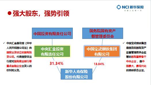 覆盖全国的销售网络,共设立1700+家分支机构,为3300万个人客户及8.3万机构客户提供全面的寿险产品及服务。认识新华强大股东,强势引领中国投资有限责任公司国务院国有资产督管理委员会中央汇金投资有限责任公司中国宝武钢铁集团有限公司新华人寿保险股份有限公司13.04%31.34%中央汇金是依据《中华人民共和国公司法》由国家出资设立的国有独资公司。代表国家依法行使对国有商业银行等重点金融企业出资人的权利和义务。中国宝武钢铁集团是国务院国有资产监督管理委员会监管的国有重要骨干中央企业,是中国最大、最现代化的钢铁联合企业。中国投资有限责任公司(简称“中投”)是一家从事外汇资金投资管理业务的国有独资公司注册资本2000亿美元,是全球最大主权财富基金之一。中投是国内正部级央企,唯一股东是国务院。
