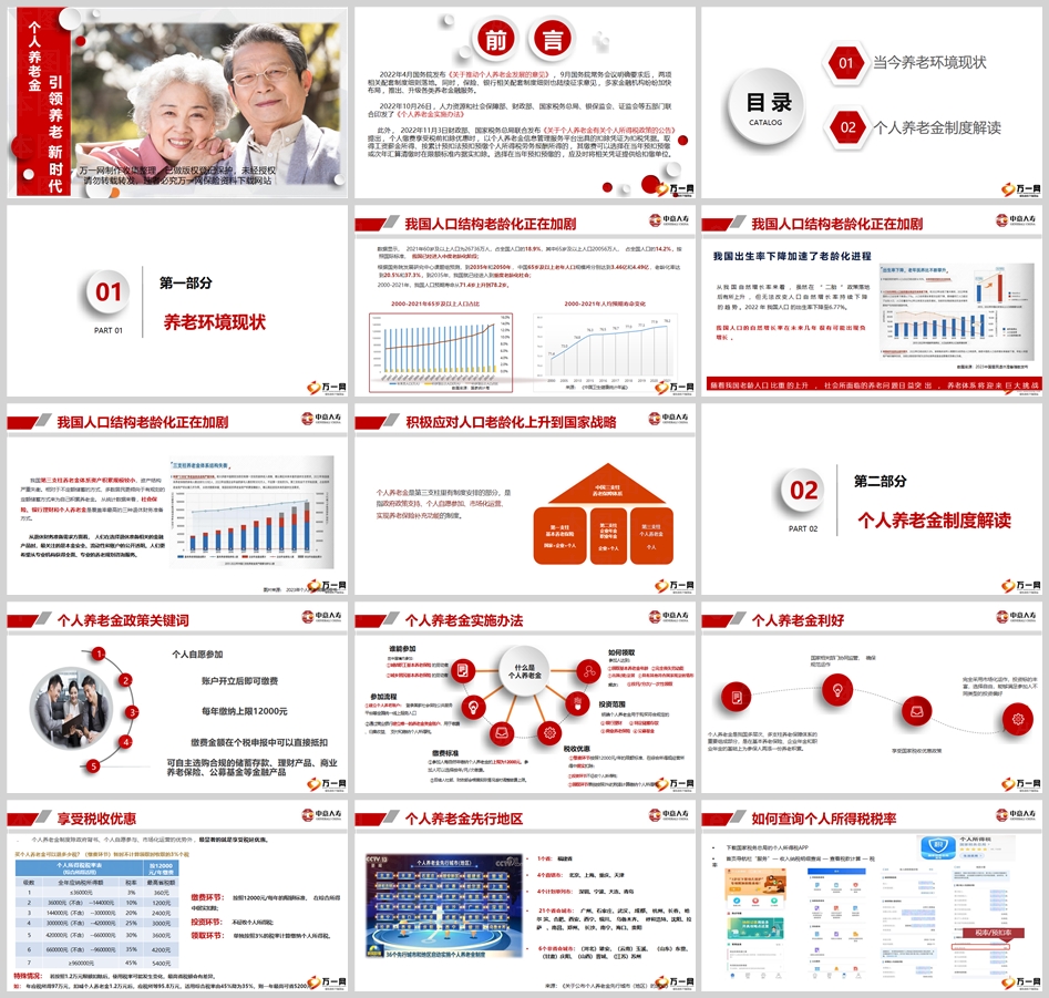 我国人口结构老龄化正在加剧积极应对人口老龄化上升到国家战略中国三支柱养老保障体系个人养老金是第三支柱里有制度安排的部分,是指政府政策支持、个人自愿参加、市场化运营、实现养老保险补充功能的制度。第一支柱基本养老保险国家+企业+个人第三支柱个人养老金个人养老金政策关键词可自主选购合规的储蓄存款、理财产品、商业 养老保险、公募基金等金融产品人养老金实施办法税收优惠①缴费环节按照12000元/年的额标准,在综合所得或经营所得中据实扣除;②投资环节不征收个人所得税;③领取环节单独按照3%的税率计算缴纳个人所得税。什么是个人养老金如何领取参加人达到:①领取基本养老金年龄②完全丧失劳动能③出国(境)定居 ④具有其他符合国家规定的情形频次: ⑤按月/分次/一次性领取缴费标准①参加人每自然年缴纳个人养老金的上限为12000元。
