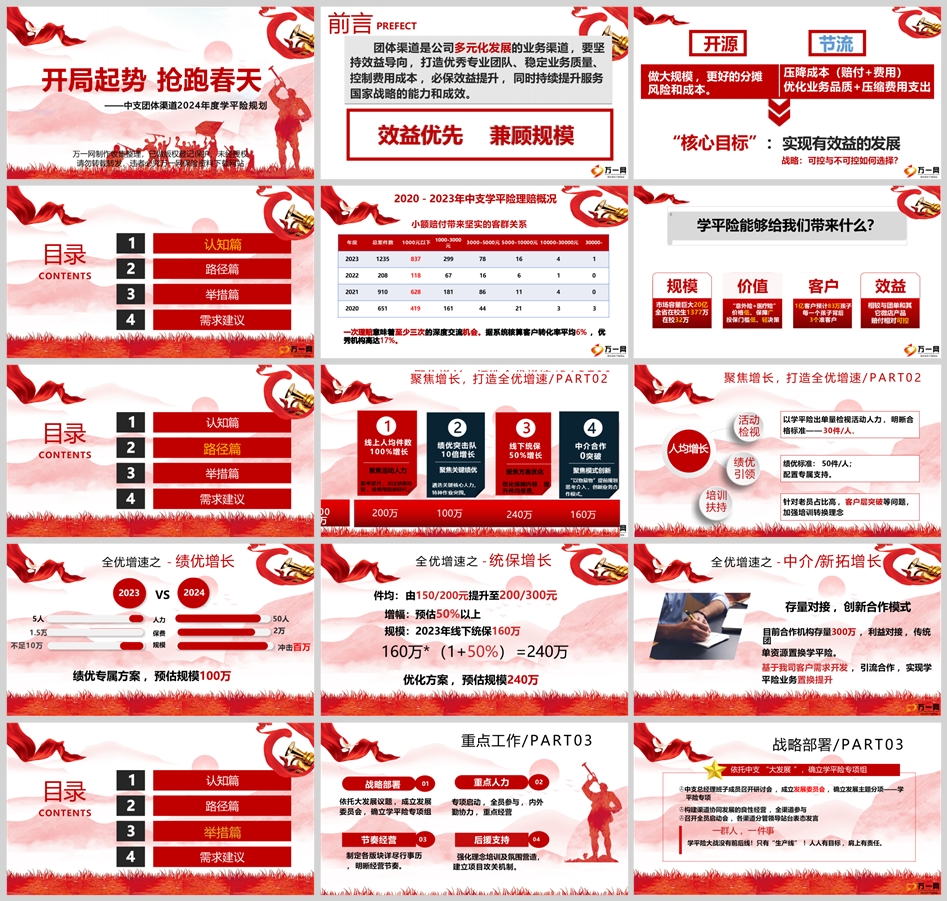 开局起势抢跑春天——中支团体渠道2024年度学平险规划团体渠道是公司多元化发展的业务渠道,要坚持效益导向,打造优秀专业团队、稳定业务质量、控制费用成本,必保效益提升同时持续提升服务国家战略的能力和成效。