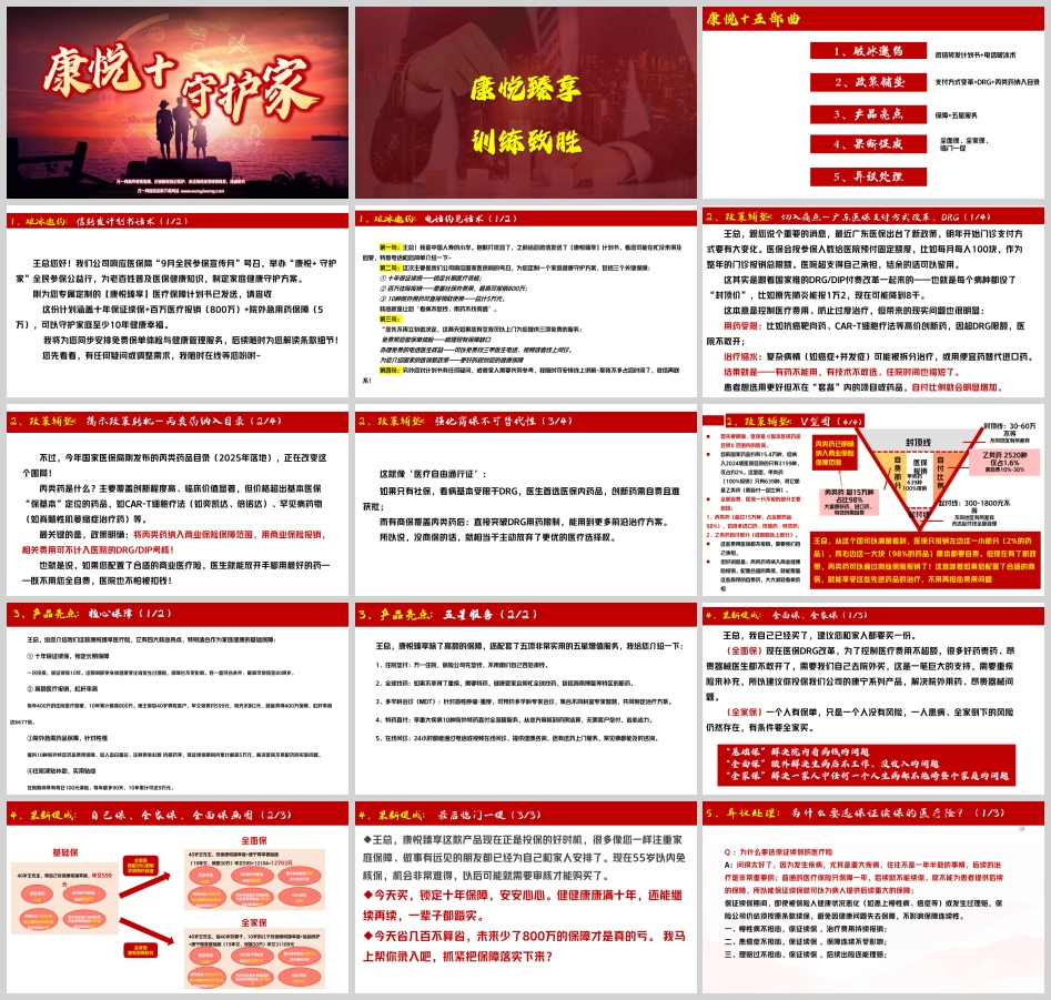 “王总,我自己已经买了,建议您和家人都要买一份。(全面保)现在医保 DRG 改革,为了控制医疗费用不超额,很多好药贵药、昂贵器械医生都不敢开了,需要我们自己去院外买,这是一笔巨大的支持,需要重疾险来补充,所以建议您投保我们公司的康宁系列产品,解决院外用药、昂贵器械问题。(全家保)一个人有保单,只是一个人没有风险,一人患病、全家倒下的风险仍然存在,有条件要全家买。”