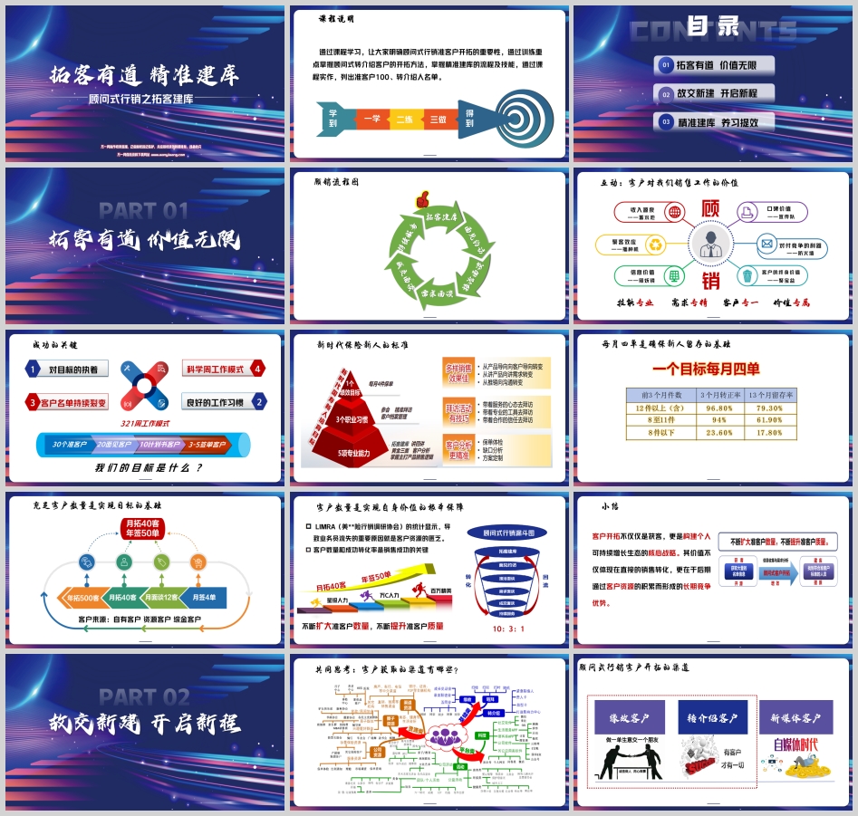 通过树立 “月拓40客,年签50单” 的清晰目标,打通 “缘故客户是转介绍客户种子” 的认知闭环,掌握 “633转介绍技能” 和 “精准建库技能” ,并扎实完成 “准客户100名单” 的梳理,保险营销人员能够建立起持续增长的客户生态体系。