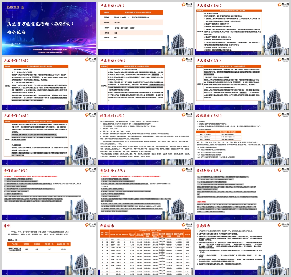 民生百万能量优行保(2025版)两全保险是一款具有丰富保障内容和灵活性的保险产品。它为投保人提供了从身故或全残保障到意外身故或全残保障(涵盖多种常见意外场景)以及满期保险金的全方位保障。在投保规则方面,对投保年龄、投保人年龄、保险期间、交费方式、保险金额、风险保额和职业范围等都有明确的规定,以确保保险产品的合理性和风险可控性。通过责任免除条款,明确了保险公司不承担赔付责任的情况,保障了保险公司的合法权益。同时,以李先生为例的利益演示让客户能够直观地了解该保险产品在不同保单年度的保险利益情况,而重要提示则提醒客户关注保险条款的详细内容,避免误解。总体而言,该保险产品适合那些希望在保障自身和家人安全、应对意外风险的同时,也能获得一定理财回报(满期保险金)的人士,为他们的生活和家庭提供了一份可靠的保障计划。