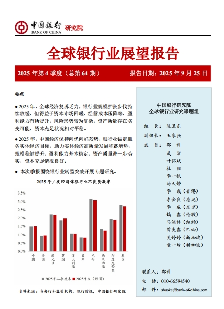 展望2025年第四季度,全球银行业将继续在复杂环境中寻求平衡发展。发达国家银行业需要重点关注资产质量变化,及时做好风险应对;新兴市场银行业则可以把握经济复苏和产业转移带来的业务机会。中国银行业在保持稳健经营的同时,需要继续加大对实体经济的支持力度。